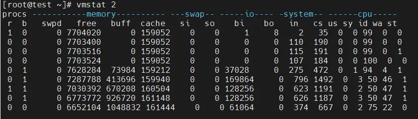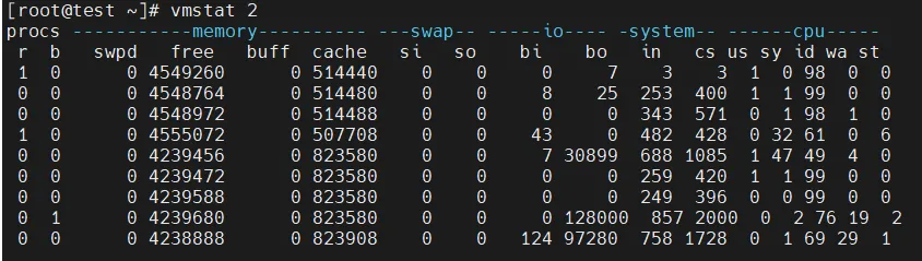 现在切换回终端 1,并观察 buff 和 cache 的变化:同样在终端 1 中,再次启动 vmstat 2 命令:您可以看到此时 buff 为 0。现在在终端 2 中,运行以下命令:观察 vmstat 的输出,你会发现在读盘的时候(也就是 bi > 0 的时候),Buffer 和 Cache 都在增长,但是显然 Buffer 的增长要快很多。这意味着当从磁盘读取时,数据被缓存在 Buffer 中。根据这俩个测试,得出个结论:读取文件时数据会缓存在 Cache 中,读取磁盘时数据会缓存在 Buffer 中。