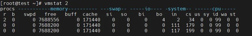 让我们登录到我们的 Linux 主机并准备好两个终端。在终端 1,让我们先清理缓存:这里 /proc/sys/vm/drop_caches 是一个通过 proc 文件系统修改内核行为的例子。写入 3 意味着清理各种缓存,例如文件页、目录条目和 Inode。仍然在终端 1,让我们开启 vmstat 2 命令:- buff 和 cache 就是我们前面看到的 Buffer 和 Cache,单位是 KB。