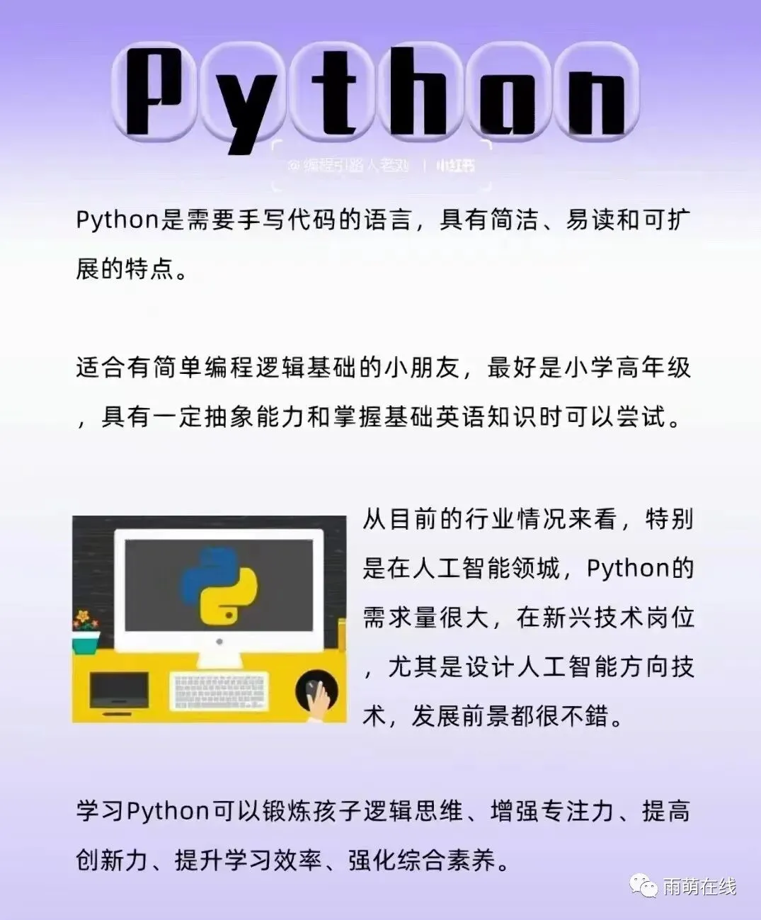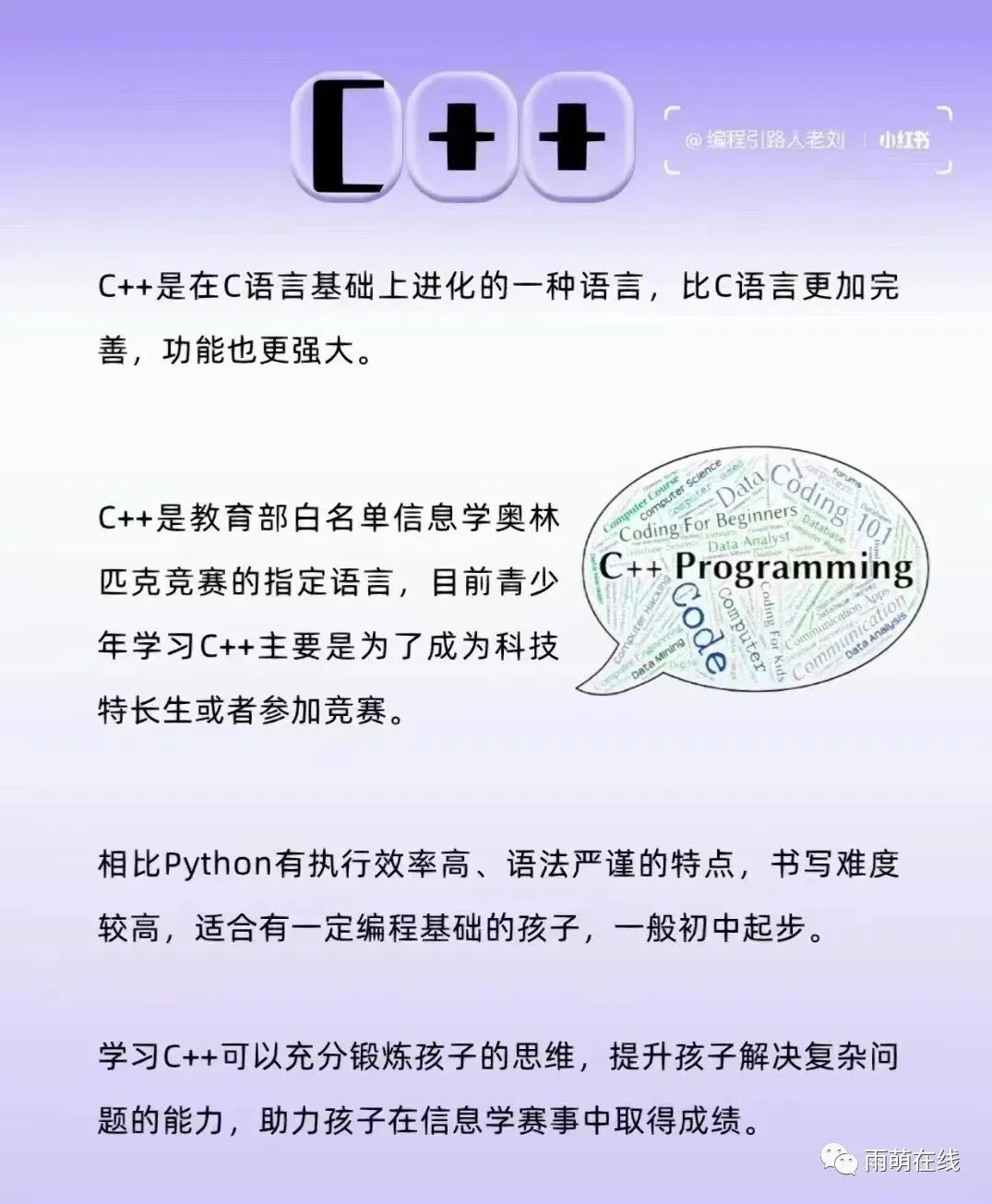 主要课程:Scratch、C++、Python、USACO白名单竞赛指导、计算机考级指导