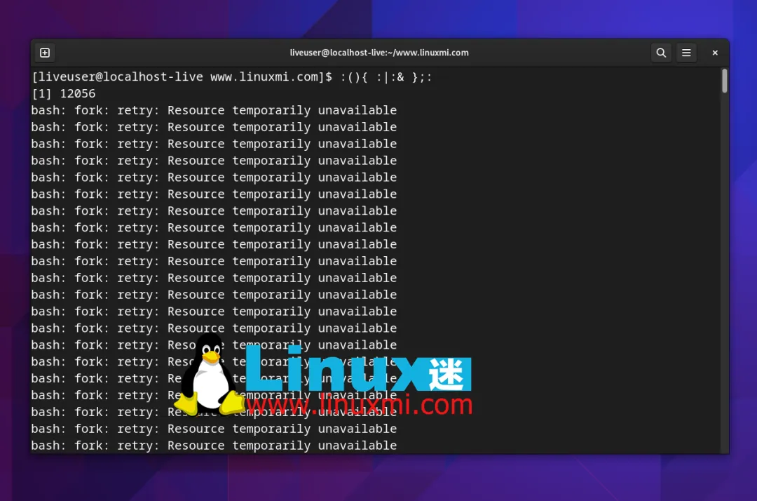 这将查找并删除所有以 .conf 结尾的文件(配置文件)。这将从你的服务器中删除整个文件系统,删除磁盘上的每个字节数据。另外,搜索公众号Linux就该这样学后台回复“Linux”,获取一份惊喜礼包。这个命令会无限制地创建自身的副本,很快就会耗尽系统的所有内存和CPU,导致系统崩溃。$ dd if=/dev/urandom of=/dev/sda
