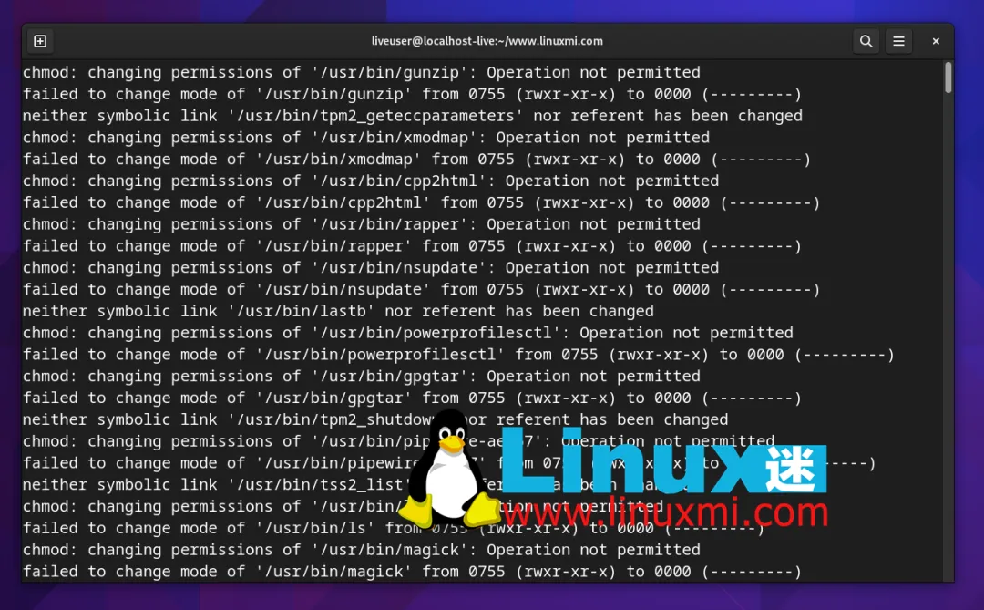 这会用随机数据填充磁盘。这个命令的另一个变体会覆盖原始数据多次,实际上,这个命令是一个有用的工具,特别是当你要丢弃旧磁盘并且不希望旧磁盘的数据落入错误的手中时(电影中还学到了另一种方法,就是可以在驱动器上钻孔)。所有上面的命令都涉及删除或覆盖数据。但是,有一些方法可以使用文件权限使系统无法使用。第一个命令是,