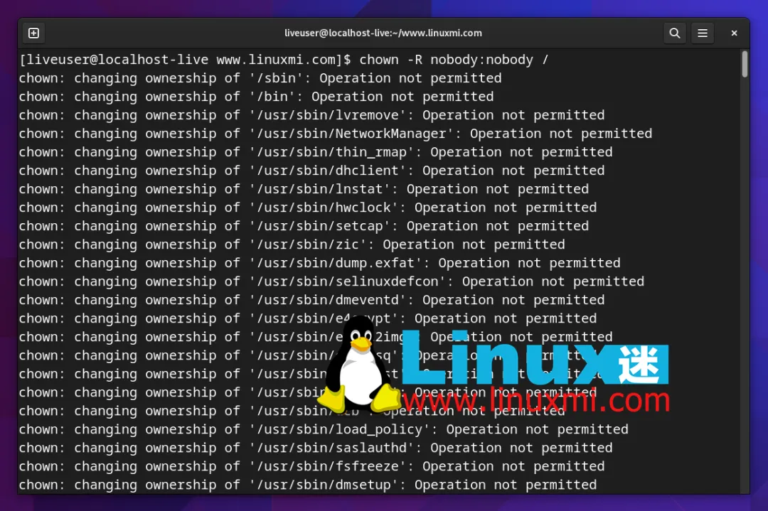 这个命令将删除系统上所有文件或文件夹的所有文件权限,由于没有人可以访问文件和文件夹,因此也就无法访问它们。这还导致了另一种编写上面命令的方法,$ chown -R nobody:nobody /