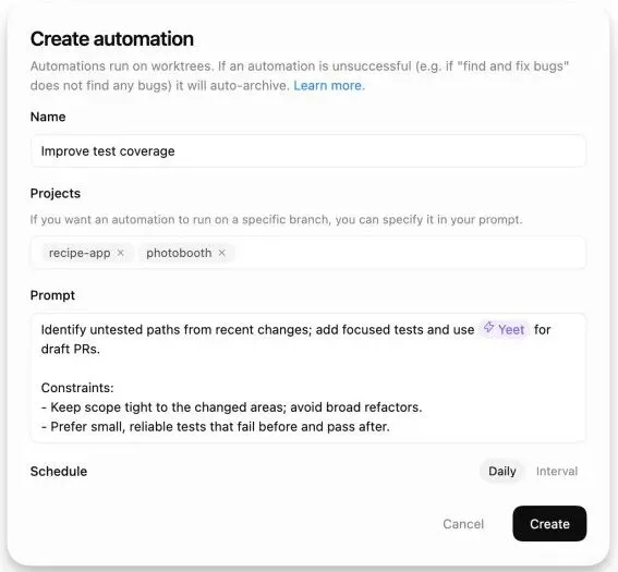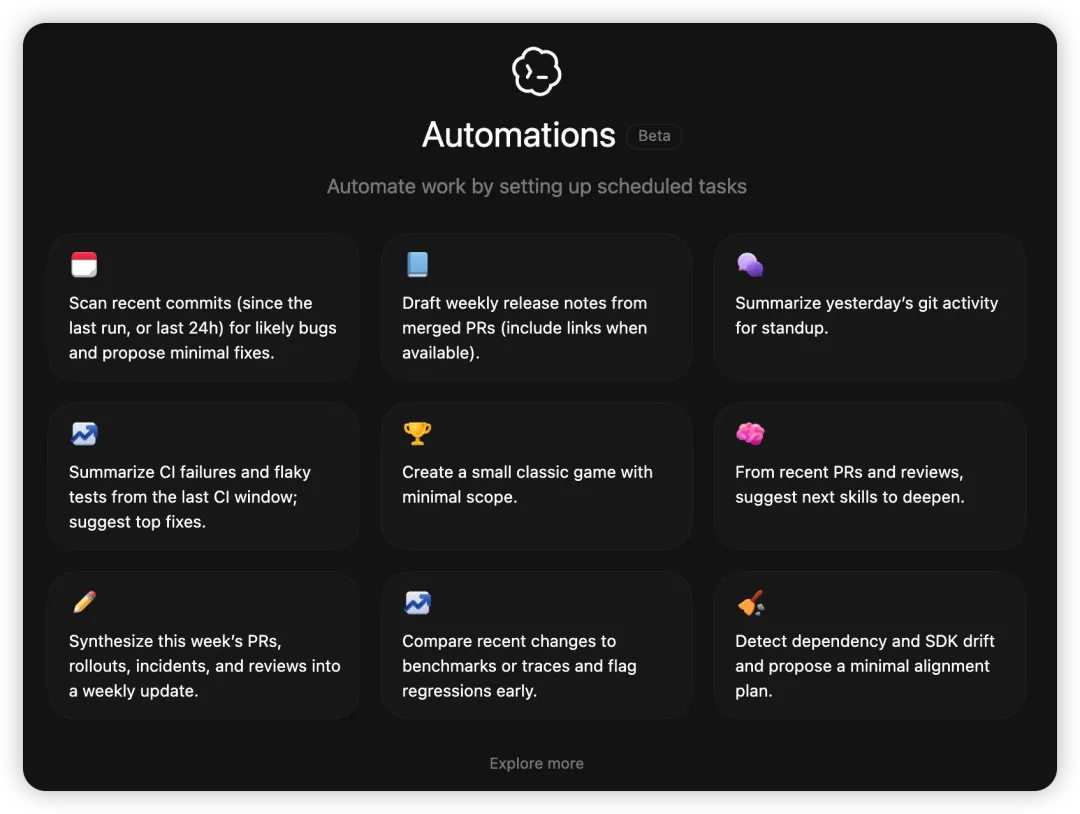 Automations 允许设置定时任务,让 Codex 在后台自动执行重复性工作。
