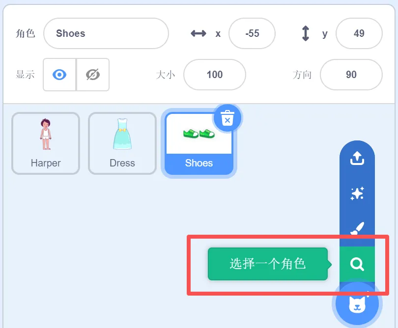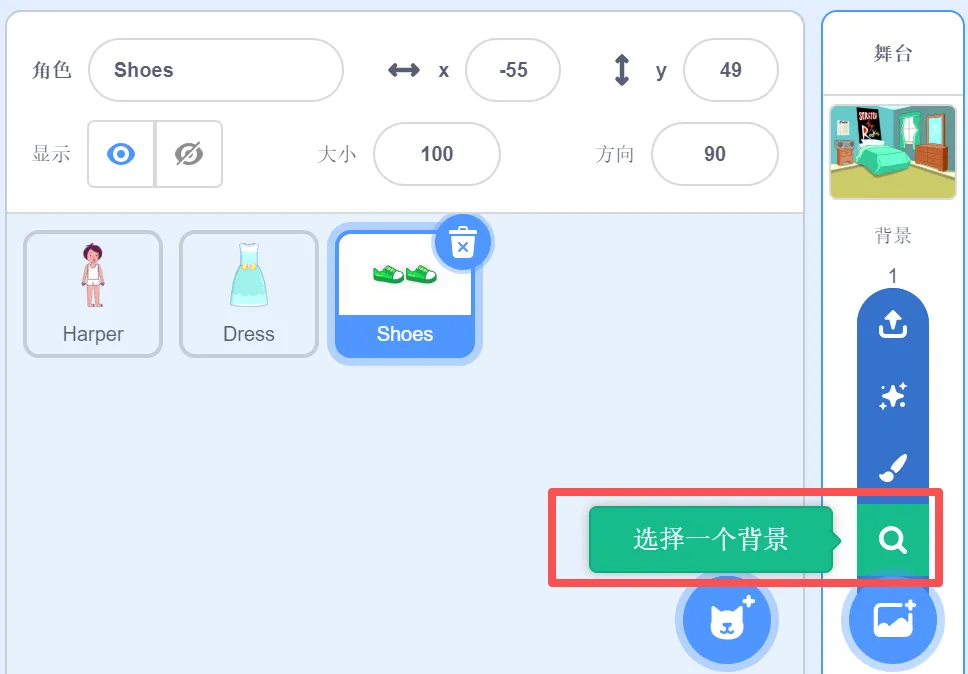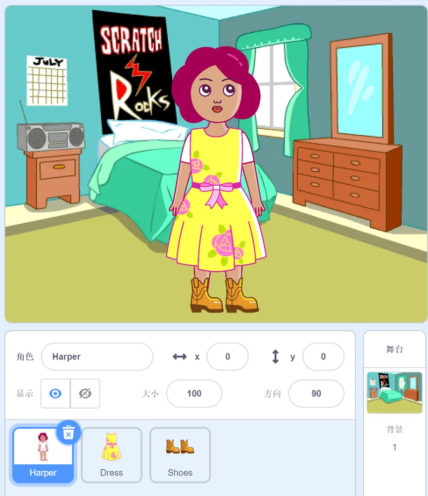 删除默认小猫角色,添加角色Harper、Dress和Shoes。