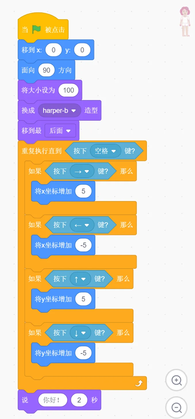 (3)按下向左“←”键,x坐标减少5,按下向右键“→”,x坐标增加5,按下向上“↑”键,y坐标增加5,按下向下“↓”键,y坐标减少5,直到按下空格键为止,按下空格键后harper说“你好!”2秒。