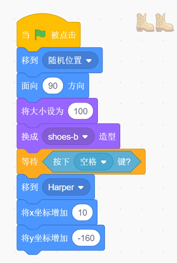 (5)按下空格键后,Shoes,移动到Harper,x坐标增加10,y坐标减少160。(4分)