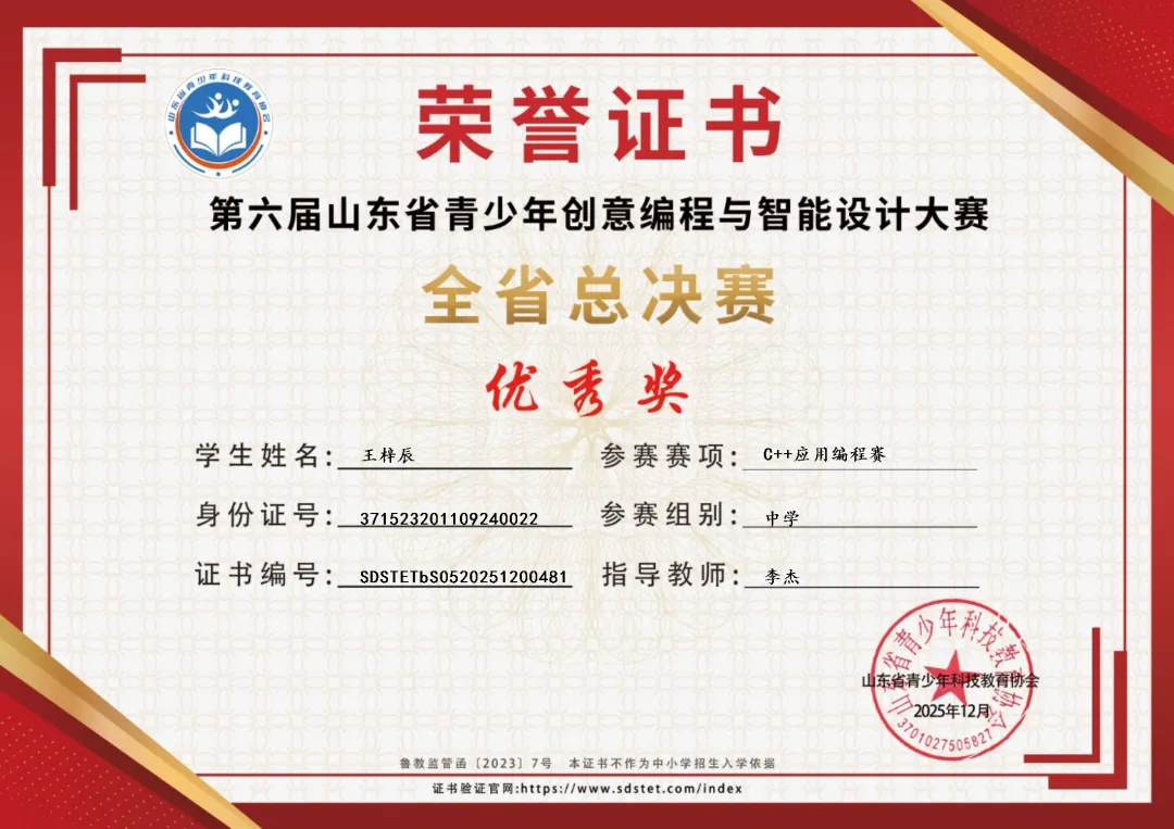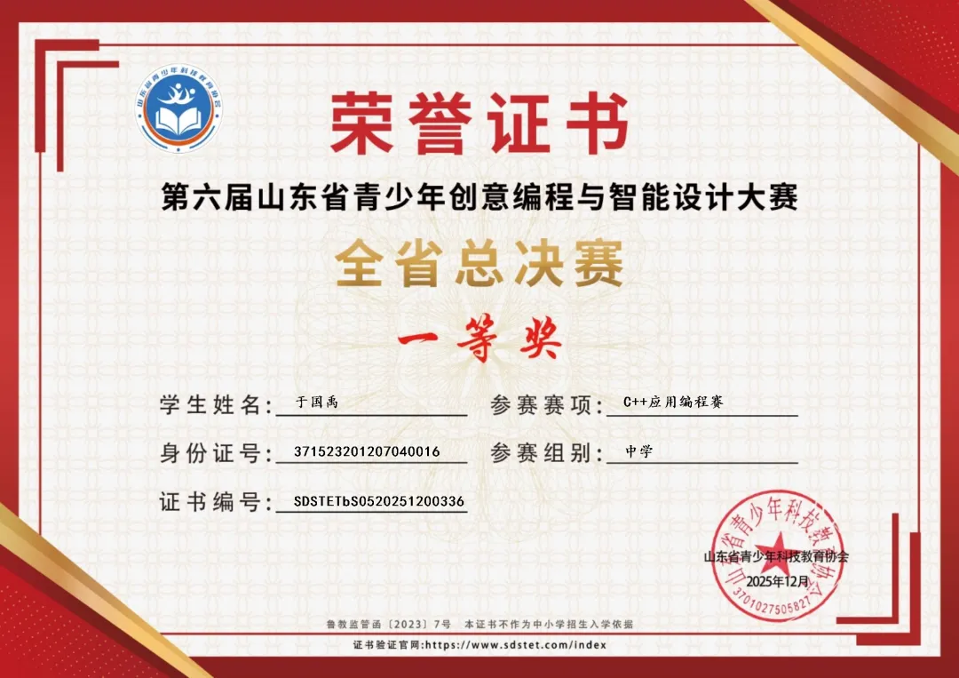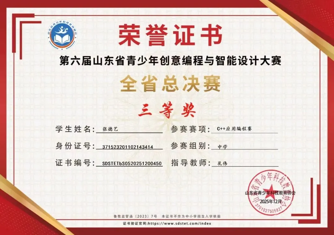 近期,第六届山东省青少年创意编程与智能设计大赛总决赛落下帷幕,作为山东省教育厅首批白名单竞赛,本次大赛以“智创未来·科技兴国”为主题,吸引了全省7600余名优秀学子同台竞技。在C++应用编程赛初中组赛项中,我校于国禹同学获得一等奖,张德艺、刘兆洋同学获得三等奖,王梓辰同学获得优秀奖,为学校科创教育再添亮眼成绩。