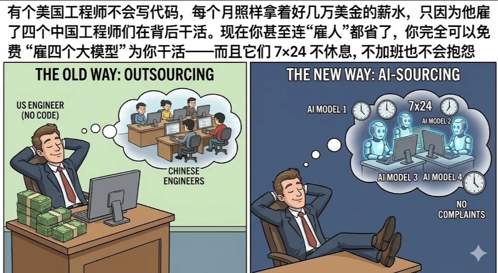 所以更现实的图景是:能熟练驾驭 AI 的工程师会替代不会用 AI 的工程师,而不是“AI 整体替代所有程序员”。你的不可替代之处在于理解业务、拆解问题、设计流程,以及为结果负责——AI 帮你干活,但短期内还抢不走你的饭碗。