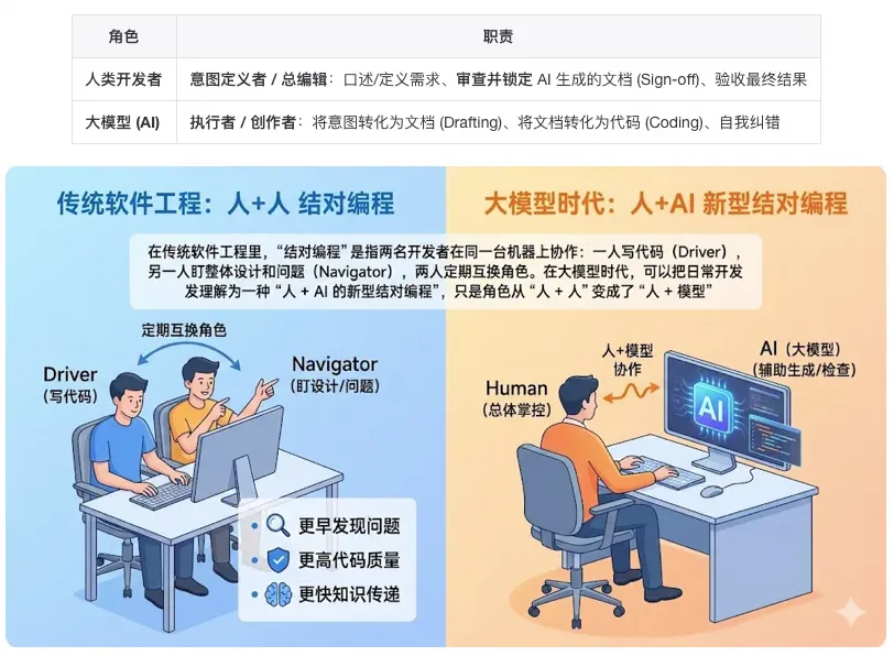 在大模型时代,可以把日常开发理解为一种“人 + AI 的新型结对编程”,只是角色从“人 + 人”变成了“人 + 模型”: