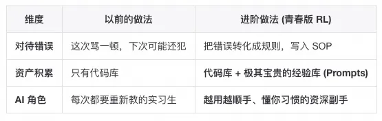 | 规则过拟合 | 因为一次特殊情况骂了 AI,导致它在 SOP 里写死了一条极其严苛的规则(如“禁止使用任何第三方库”),导致后续任务卡死。 | 定期 Review 你的 Prompt/SOP 文件*。像重构代码一样重构 Prompt,删除过时或太死板的规则,保持指令的通用性。 |