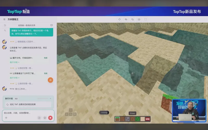 随后,演示进入了更为硬核的“现场构建”环节。黄一孟要求AI打造一个类似《我的世界》的体素沙盒游戏。