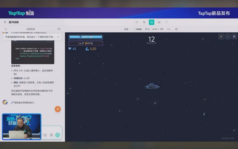 但黄一孟指出,由于“TapTap制造”基于云端引擎的文件系统,AI对整个工程拥有“记忆”和索引能力。在演示中,他要求AI为飞船添加一个“类似星球大战的空间跳跃动画”。这是一个涉及摄像机运镜、粒子系统控制以及场景切换的复合需求,AI最终在无需人工干预的情况下,成功将这段复杂的演出逻辑插入到了庞大的现有代码库中,且未破坏原有功能。