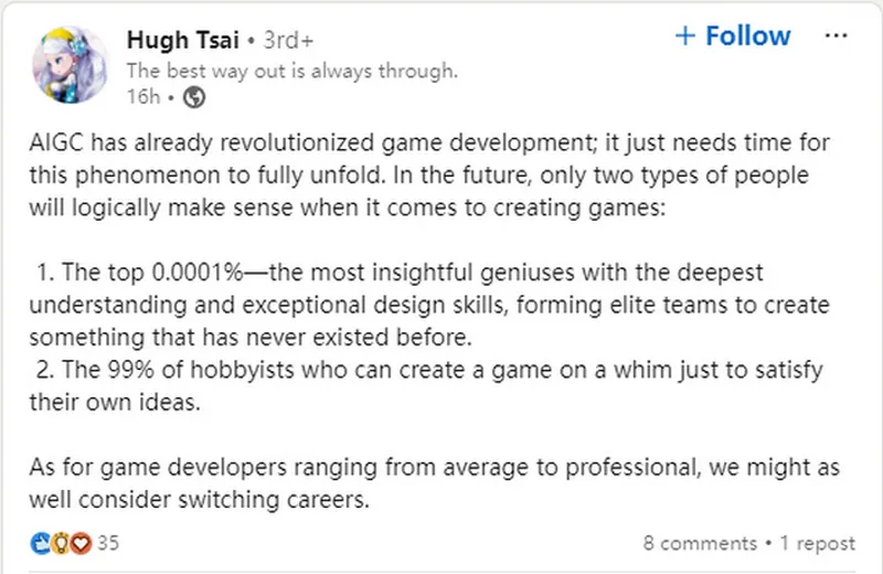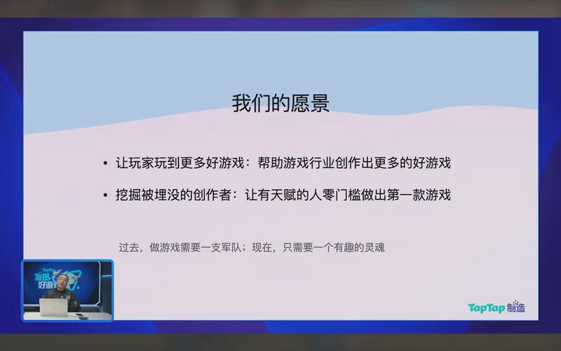 黄一孟还引用了米哈游创始人蔡浩宇关于“未来只有0.1%的人做工业化大作,99%的爱好者做游戏满足自己”的论断,表示“TapTap制造”正是为了服务那99%的人群。通过降低成本,让更多不以盈利为第一目的的创意涌现,进而反哺TapTap的内容生态。