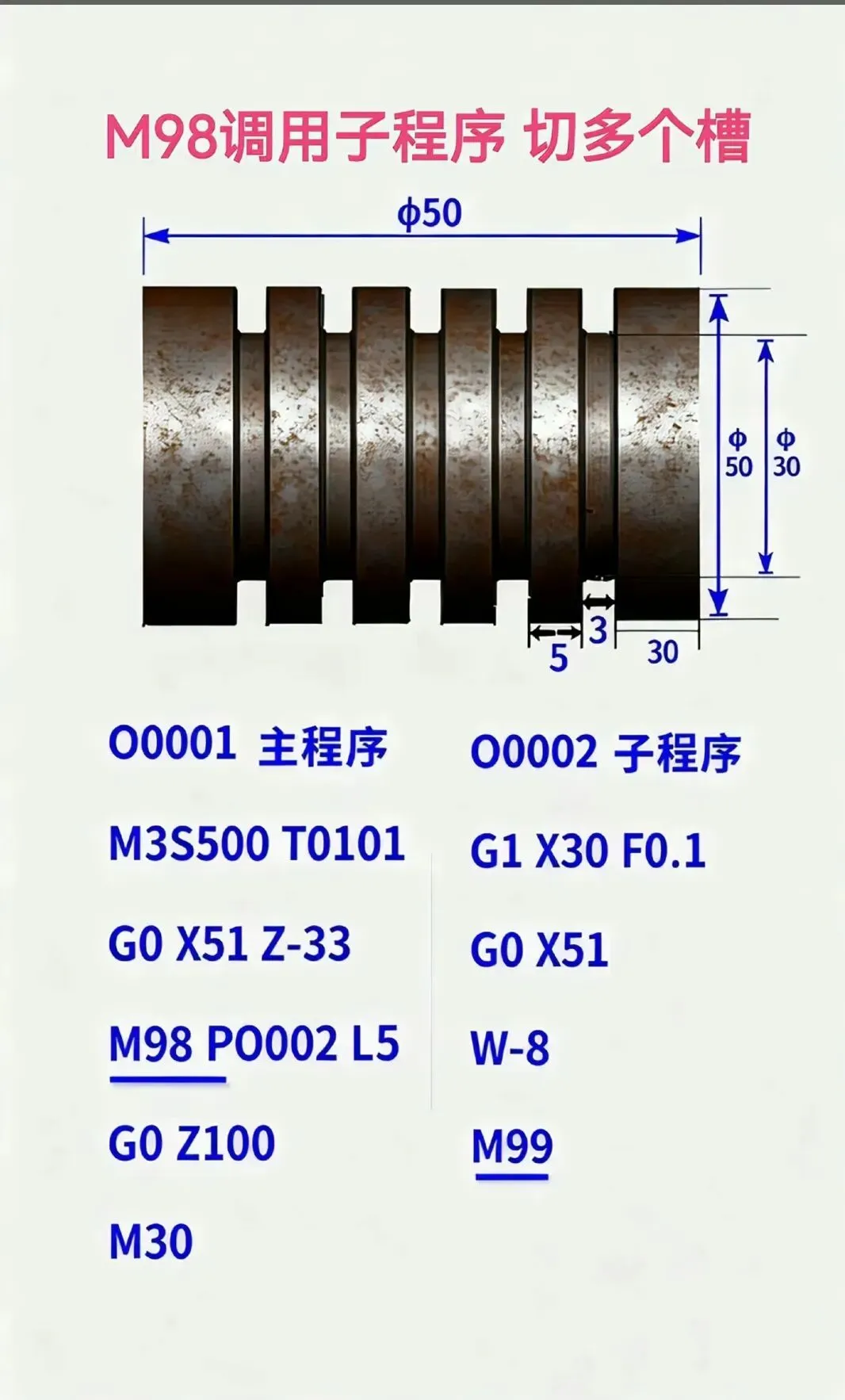 做数控的兄弟们都知道,多槽轴类零件加工时,重复切槽的代码写起来又繁琐又容易出错… 但要是学会「M98调用子程序」,不仅代码量暴减,效率还能直接起飞!今天就用实例教你玩转它~