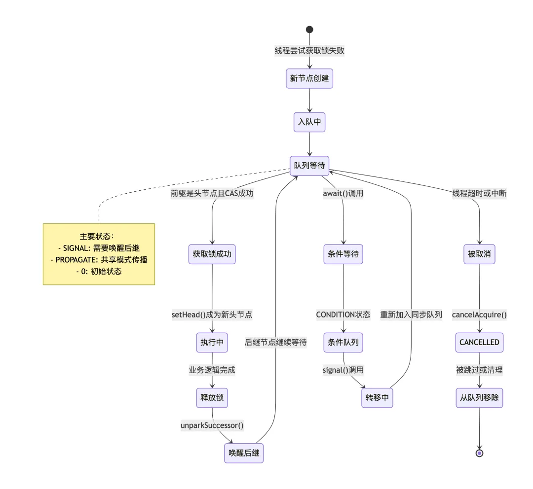 AQS内部维护了一个FIFO双向队列(CLH锁的变体),当线程获取同步状态失败时,会被包装成Node节点加入队列: