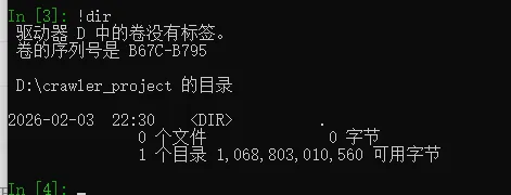 # 查看当前目录文件(Windows)!dir# 安装依赖包!py -m pip install requests# 切换目录%cd D:\crawler_project