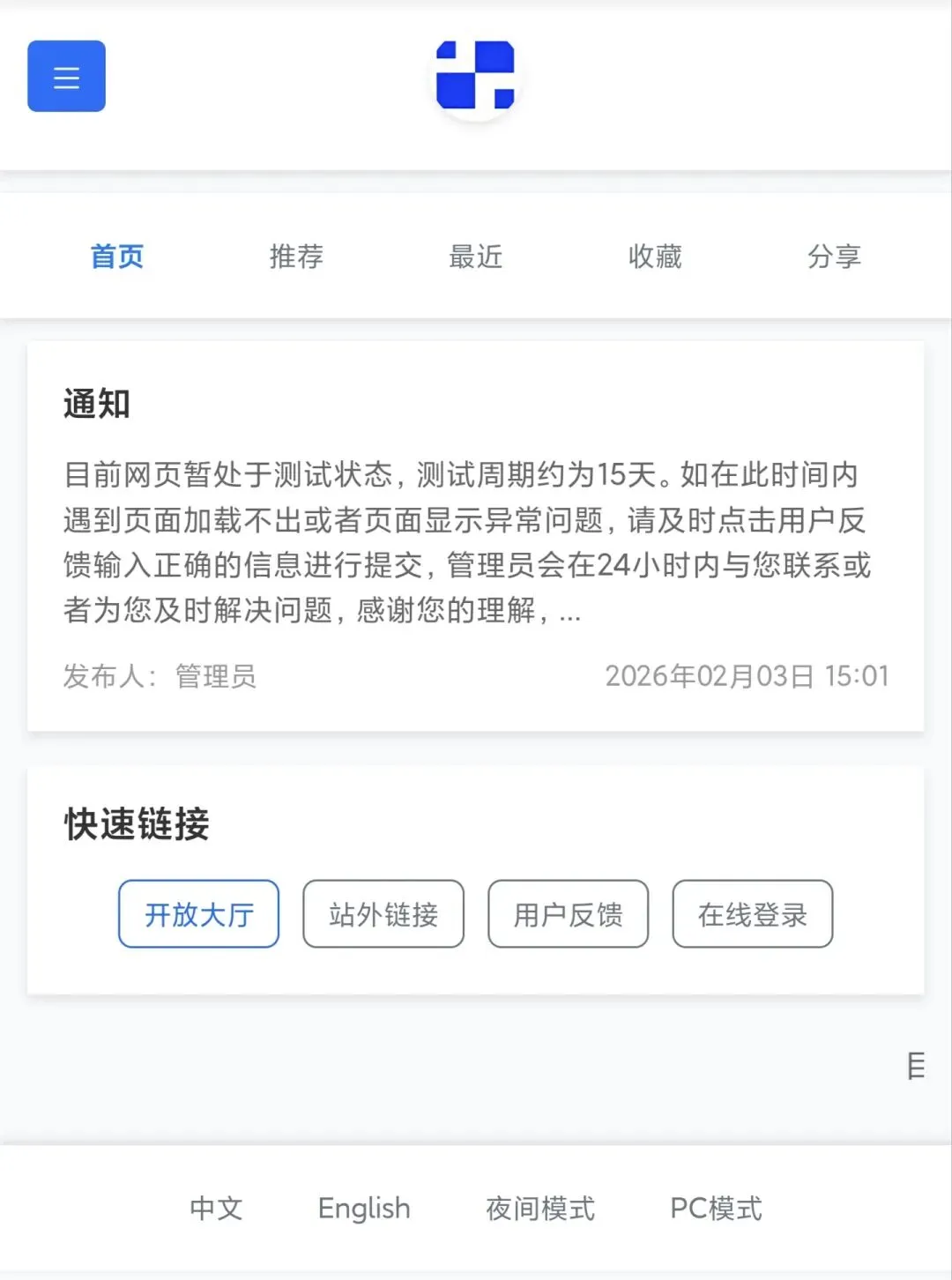 5、网站支持设备自动识别功能,可根据访问的电脑、手机等设备智能匹配对应显示方式,若遇设备匹配错误,可手动切换显示模式解决。(1)PC端(如下图)