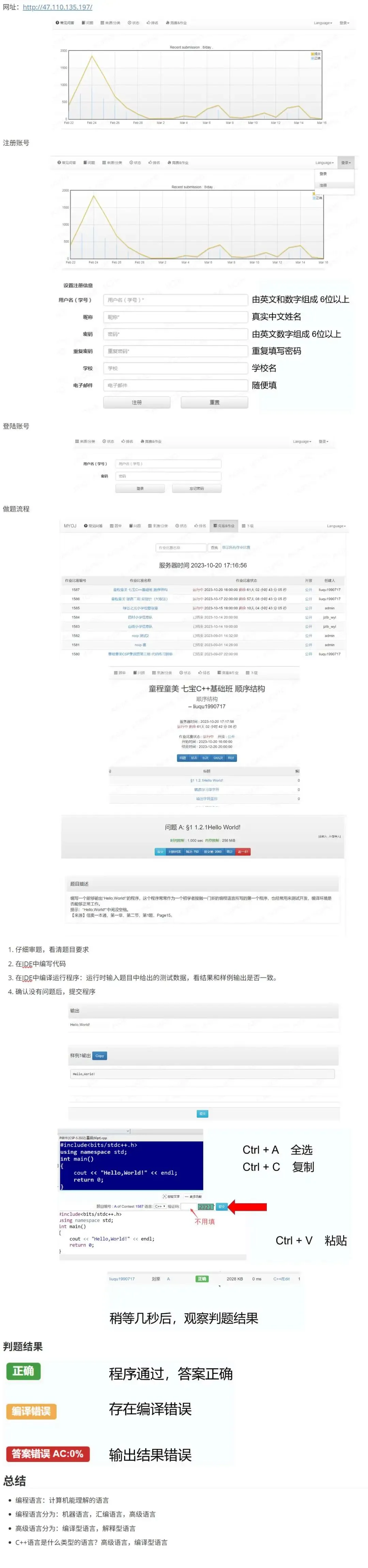 Online Judge系统(简称OJ)是一个在线的判题系统。用户可以在线提交程序多种程序(如C、C++、Pascal)源代码,系统对源代码进行编译和执行,并通过预先设计的测试数据来检验程序源代码的正确性。