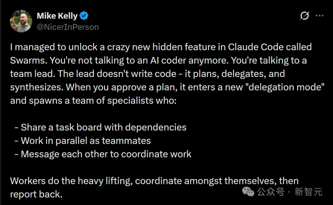 爆料的关键人叫Mike Kelly,他在X上爆了个猛料:Claude Code里,藏着一个尚未公开的 Swarm功能。