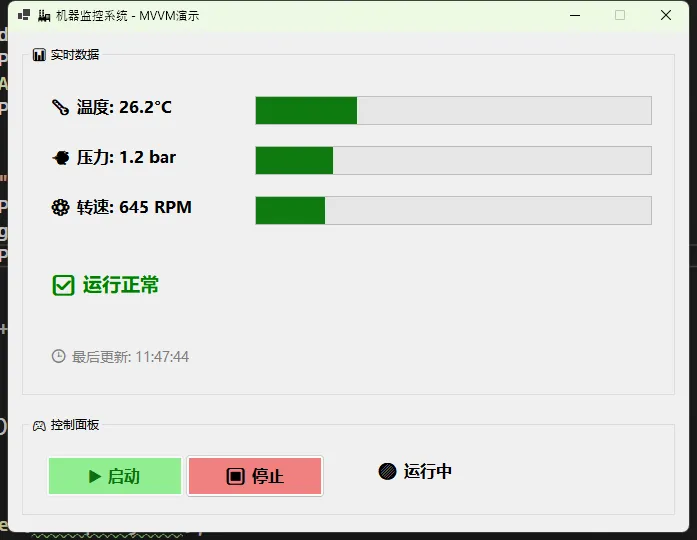 namespaceAppWinformMvvm{publicpartialclassForm1 : Form {private MachineViewModel _machineVM;publicForm1() { InitializeComponent(); InitializeViewModel(); SetupDataBindings(); }///<summary>/// 初始化ViewModel///</summary>privatevoidInitializeViewModel() { _machineVM = new MachineViewModel(); }///<summary>/// 设置数据绑定///</summary>privatevoidSetupDataBindings() {// 🔥 核心:数据绑定设置// 当ViewModel的属性变化时,这些控件会自动更新!var tempBinding = new Binding("Text", _machineVM, "Temperature", true, DataSourceUpdateMode.OnPropertyChanged); tempBinding.Format += (s, e) => {if (e.Value isdouble temp) e.Value = $"🌡️ 温度: {temp:F1}°C"; }; lblTemperature.DataBindings.Add(tempBinding);var pressureBinding = new Binding("Text", _machineVM, "Pressure", true, DataSourceUpdateMode.OnPropertyChanged); pressureBinding.Format += (s, e) => {if (e.Value isdouble pressure) e.Value = $"💨 压力: {pressure:F1} bar"; }; lblPressure.DataBindings.Add(pressureBinding);var speedBinding = new Binding("Text", _machineVM, "Speed", true, DataSourceUpdateMode.OnPropertyChanged); speedBinding.Format += (s, e) => {if (e.Value isdouble speed) e.Value = $"⚙️ 转速: {speed:F0} RPM"; }; lblSpeed.DataBindings.Add(speedBinding);var updateBinding = new Binding("Text", _machineVM, "LastUpdateTimeText", true, DataSourceUpdateMode.OnPropertyChanged); updateBinding.Format += (s, e) => {if (e.Value isstring timeText) e.Value = $"🕒 最后更新: {timeText}"; }; lblLastUpdate.DataBindings.Add(updateBinding);// 进度条绑定 progressTemperature.DataBindings.Add("Value", _machineVM, "Temperature", true, DataSourceUpdateMode.OnPropertyChanged); progressSpeed.DataBindings.Add("Value", _machineVM, "Speed", true, DataSourceUpdateMode.OnPropertyChanged);// 状态绑定 lblStatus.DataBindings.Add("Text", _machineVM, "Status", true, DataSourceUpdateMode.OnPropertyChanged); lblRunningStatus.DataBindings.Add("Text", _machineVM, "RunningStatusText", true, DataSourceUpdateMode.OnPropertyChanged);// 🔥 处理需要特殊处理的UI更新 _machineVM.PropertyChanged += (s, e) => {// 确保在UI线程执行if (InvokeRequired) { Invoke(new Action(() => HandlePropertyChanged(e.PropertyName))); }else { HandlePropertyChanged(e.PropertyName); } };// 按钮事件绑定 btnStart.Click += BtnStart_Click; btnStop.Click += BtnStop_Click;// 初始按钮状态 UpdateButtonStates(false); }///<summary>/// 处理属性变更的UI更新///</summary>privatevoidHandlePropertyChanged(string propertyName) {try {switch (propertyName) {case"Pressure":// 压力进度条需要特殊处理(范围转换)var pressureValue = (int)(_machineVM.Pressure * 10); progressPressure.Value = Math.Max(0, Math.Min(progressPressure.Maximum, pressureValue));break;case"Status":// 根据状态改变标签颜色 UpdateStatusColor();break;case"IsRunning":// 更新按钮状态 UpdateButtonStates(_machineVM.IsRunning);break; } }catch (Exception ex) {// 防止UI更新异常影响整个应用 System.Diagnostics.Debug.WriteLine($"UI更新时发生错误: {ex.Message}"); } }///<summary>/// 更新状态标签颜色///</summary>privatevoidUpdateStatusColor() {if (_machineVM.Status.Contains("报警") || _machineVM.Status.Contains("过高") || _machineVM.Status.Contains("超限")) lblStatus.ForeColor = Color.Red;elseif (_machineVM.Status.Contains("⚠️")) lblStatus.ForeColor = Color.Orange;elseif (_machineVM.Status.Contains("❄️")) lblStatus.ForeColor = Color.Blue;else lblStatus.ForeColor = Color.Green; }///<summary>/// 更新按钮状态///</summary>privatevoidUpdateButtonStates(bool isRunning) { btnStart.Enabled = !isRunning; btnStop.Enabled = isRunning; }///<summary>/// 启动按钮点击事件///</summary>privatevoidBtnStart_Click(object sender, EventArgs e) {try { _machineVM.StartMachine(); ShowStatusMessage("机器启动成功!", MessageBoxIcon.Information); }catch (Exception ex) { ShowStatusMessage($"启动失败: {ex.Message}", MessageBoxIcon.Error); } }///<summary>/// 停止按钮点击事件///</summary>privatevoidBtnStop_Click(object sender, EventArgs e) {try { _machineVM.StopMachine(); ShowStatusMessage("机器已停止运行", MessageBoxIcon.Information); }catch (Exception ex) { ShowStatusMessage($"停止失败: {ex.Message}", MessageBoxIcon.Error); } }///<summary>/// 显示状态消息///</summary>privatevoidShowStatusMessage(string message, MessageBoxIcon icon) { MessageBox.Show(message, "系统消息", MessageBoxButtons.OK, icon); }///<summary>/// 窗体关闭时清理资源///</summary>protectedoverridevoidOnFormClosed(FormClosedEventArgs e) {try { _machineVM?.Dispose(); }catch (Exception ex) { System.Diagnostics.Debug.WriteLine($"资源清理时发生错误: {ex.Message}"); }finally {base.OnFormClosed(e); } }///<summary>/// 处理未捕获的异常///</summary>protectedoverridevoidOnLoad(EventArgs e) {base.OnLoad(e);// 添加全局异常处理 Application.ThreadException += Application_ThreadException; AppDomain.CurrentDomain.UnhandledException += CurrentDomain_UnhandledException; }privatevoidApplication_ThreadException(object sender, System.Threading.ThreadExceptionEventArgs e) { ShowStatusMessage($"应用程序异常: {e.Exception.Message}", MessageBoxIcon.Error); }privatevoidCurrentDomain_UnhandledException(object sender, UnhandledExceptionEventArgs e) {if (e.ExceptionObject is Exception ex) { ShowStatusMessage($"未处理异常: {ex.Message}", MessageBoxIcon.Error); } } }}
