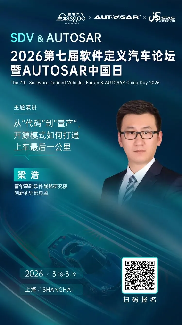 在此背景下,盖世汽车2026第七届软件定义汽车论坛暨AUTOSAR中国日将聚焦软件定义汽车,围绕车载通信解决方案、SOA架构、车云计算、智驾域中间件、高性能计算软件平台等行业焦点进行讨论。在AUTOSAR中国日活动中,多位专家也将围绕AUTOSAR中国区发展、AUTOSAR新发布功能等话题进行分享,共同探讨未来汽车软件技术趋势。