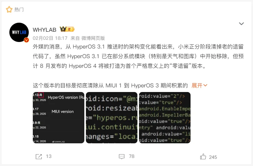 家人们,小米系统终于要“轻装上阵”了😭 据多家权威科技媒体及外媒爆料,小米正在分阶段清除MIUI时代积累的大量遗留代码,目前澎湃OS 3.1版本已率先启动试点清理,而预计今年8月发布的澎湃OS 4,有望成为首个“零遗留”版本,彻底摆脱MIUI的影子,成为小米史上最稳定、最精简的系统版本。