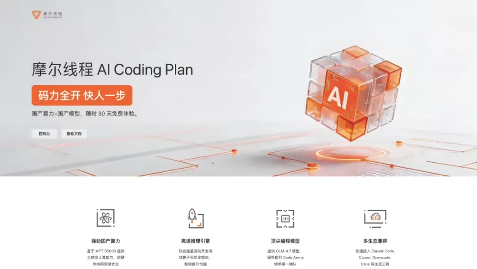 1、摩尔线程推出首个全栈国产 AI 编程服务,可免费体验 30 天2月3日消息,摩尔线程今日宣布推出 AI Coding Plan 智能编程服务,可免费体验 30 天。摩尔线程介绍称,作为首个基于国产全功能 GPU 算力底座构建的智能开发解决方案,该服务以 MTT S5000 的全精度计算能力为核心驱动,融合硅基流动推理加速引擎,并集成 GLM-4.7 代码模型,成功实现了国产芯片与国产大模型在 AI Coding 领域的突破,标志着国产算力在 AI 核心生产力工具领域打破瓶颈。全新推出的 AI Coding Plan 依托摩尔线程 MTT S5000 的全精度计算能力,宣称通过软硬件协同架构实现了“算力效能的倍增”。摩尔线程与硅基流动联合开发,通过算子融合及框架优化,在确保代码生成质量的同时降低了响应延迟。