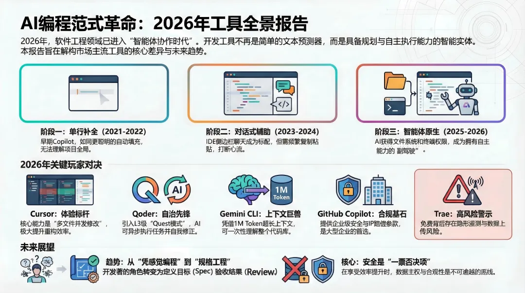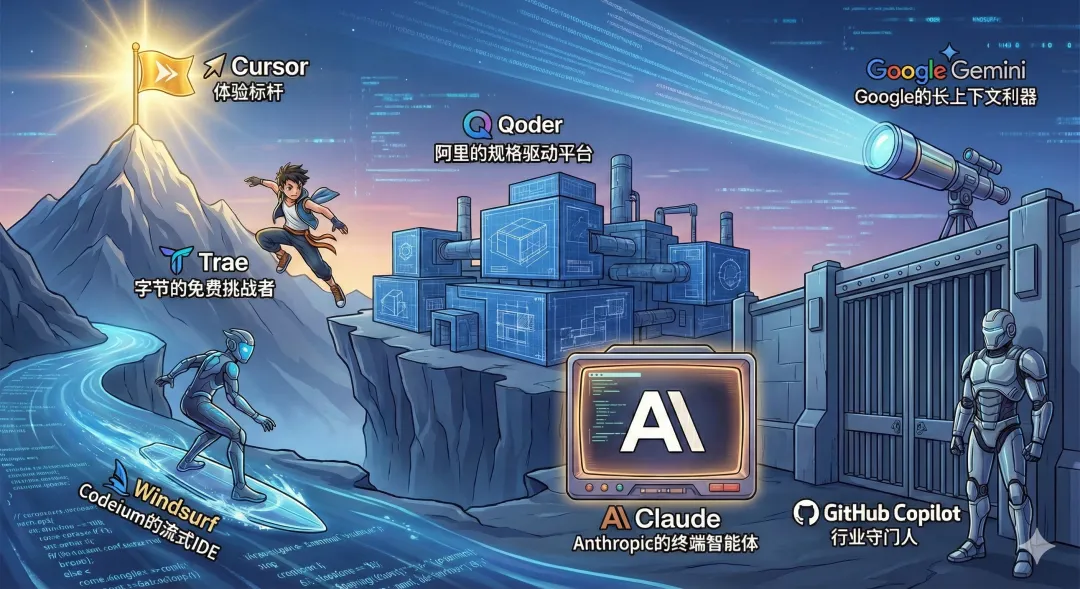 本评估报告基于八大核心维度(交互形态、上下文感知、模型能力、智能体能力、安全合规、开发者体验、成本与生态维度),对当前市场上的七款主流工具进行了深度解构:Cursor(体验标杆)、Trae(字节的免费挑战者)、Windsurf(Codeium的流式IDE)、Qoder(阿里的规格驱动平台)、Claude Code(Anthropic的终端智能体)、Gemini CLI(Google的长上下文利器)以及GitHub Copilot(行业守门人),旨在为企业CTO、技术团队负责人及高级软件工程师提供一份详尽的决策参考。
