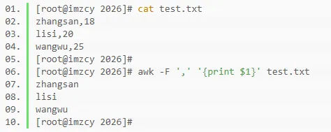 如下awk命令通过-F选项指定字段分隔符为英文逗号,空模式匹配所有行,动作为输出test.txt文件中匹配行数据中逗号分隔的第一个字段的内容。
