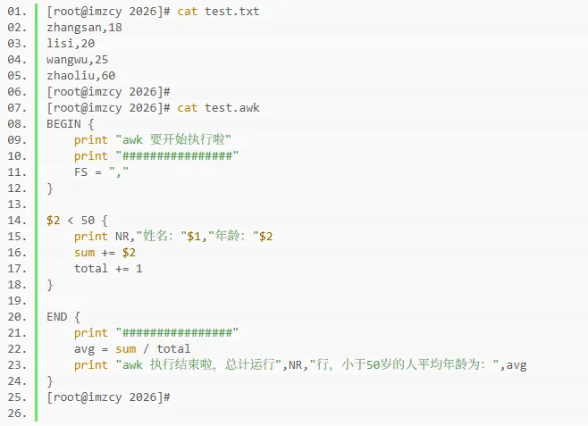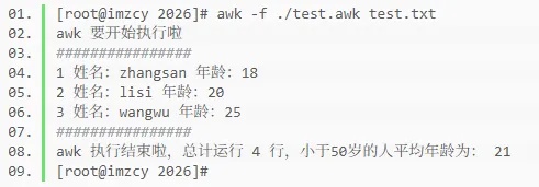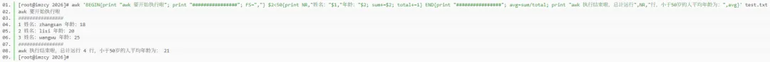 END { print "################" avg = sum / total print "awk 执行结束啦,文件总计",NR,"行,成功匹配",total,"行,小于50岁的人平均年龄为:",avg}