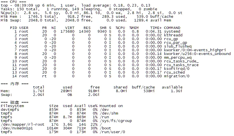 # 安装必要工具watch -n 2 "echo '=== CPU ===' && top -bn1 | head -20 && echo '' && echo '=== 内存 ===' && free -h && echo '' && echo '=== 磁盘 ===' && df -h"