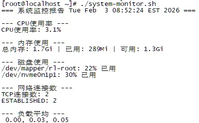 #!/bin/bashecho "=== 系统监控报告 $(date) ==="echo ""echo "--- CPU使用率 ---"top -bn1 | grep "Cpu(s)" | sed "s/.*, *\([0-9.]*\)%* id.*/\1/" | awk '{print "CPU使用率: " 100 - $1"%"}'echo ""echo "--- 内存使用 ---"free -h | grep Mem | awk '{print "总内存: "$2" | 已用: "$3" | 可用: "$7}'echo ""echo "--- 磁盘使用 ---"df -h | grep -E '^/dev/' | awk '{print $1": "$5" 已用"}'echo ""echo "--- 网络连接数 ---"echo "TCP连接数: $(ss -t | wc -l)"echo "ESTABLISHED: $(ss -t state established | wc -l)"echo ""echo "--- 负载平均 ---"uptime | awk -F'load average:' '{print $2}'
