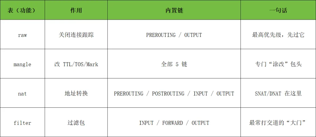 数据包进入网络栈 | v+----------------+ raw 先行| raw表 | (连接跟踪前处理)| (PREROUTING) | 用于跳过连接跟踪+----------------+ | v+----------------+ mangle 涂改| mangle表 | (修改数据包标记)| (PREROUTING) | 如TOS、TTL等+----------------+ | v+----------------+ nat 地址转换| nat表 | (地址和端口转换)| (PREROUTING) | DNAT或重定向+----------------+ | v+----------------+ filter 最后把门开| filter表 | (过滤:允许或拒绝)| (INPUT链) | 决定数据包去向+----------------+ | v[ 允许通过 ] 或 [ 丢弃/拒绝 ]