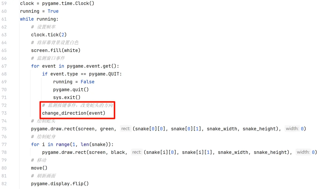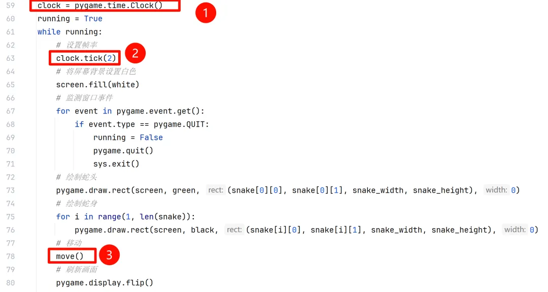 def move(): for i in range(len(snake) - 1, -1, -1): if snake[i][2] == "L": # 向左移动,x坐标-10 snake[i][0] -= snake_width elif snake[i][2] == "R": # 向右移动,x坐标+10 snake[i][0] += snake_width elif snake[i][2] == "U": # 向上移动,y坐标-10 snake[i][1] -= snake_height elif snake[i][2] == "D": # 向下移动,y坐标+10 snake[i][1] += snake_height if i > 0: # 更新方向,后面一个蛇节的方向是上一个蛇节的方向 snake[i][2] = snake[i - 1][2]