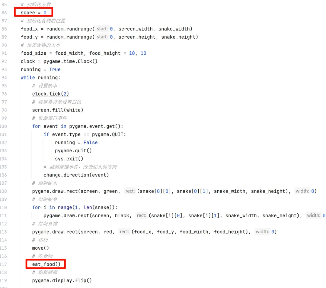 1)创建eat_food()方法,检测是否吃到食物,创建方法之前记得新建分数变量score