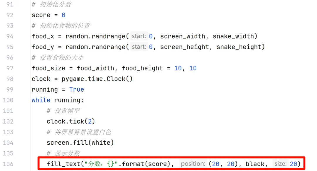 2)使用随机模块中的randrange(start, stop, step)方法,随机生成食物的位置,设置食物的大小,使用draw模块中的rect绘制矩形方法,绘制食物