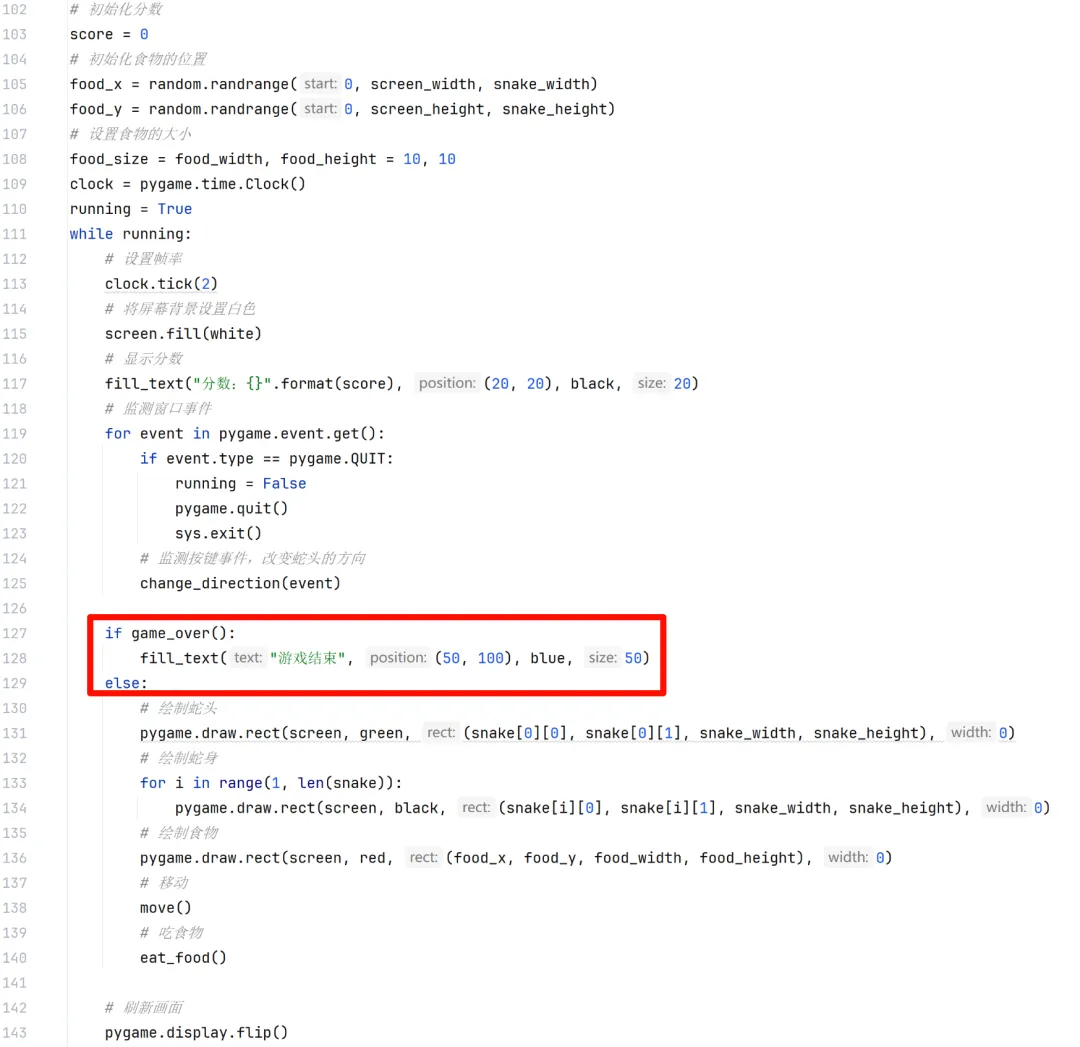def game_over(): # 出界判断(屏幕宽度) if not (snake[0][0] >= 0 and snake[0][0] <= screen_width and snake[0][1] >= 0 and snake[0][1] <= screen_height): return True # 咬到身体判断 for i in range(1, len(snake)): if snake[0][0] == snake[i][0] and snake[0][1] == snake[i][1]: return True return False