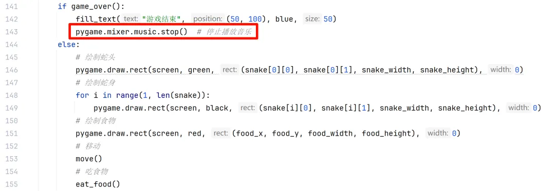 # 加载背景音乐文件,设置播放pygame.mixer.music.load(r'./music/bgmusic.wav')# -1循环播放 正数播放次数pygame.mixer.music.play(-1)# 加载音效文件,设置音效eat = pygame.mixer.Sound(r'./music/eatapple.wav')hit = pygame.mixer.Sound(r'./music/hitwall.wav')# 调节音量eat.set_volume(1)hit.set_volume(1)