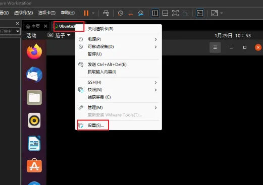 鼠标放到Ubuntu20上,右击选择设置,如下:
