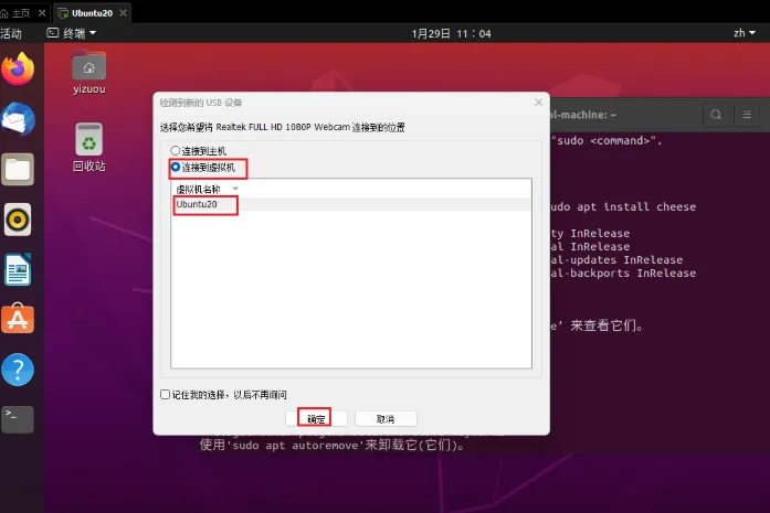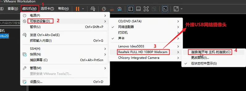 将鼠标移至虚拟机界面并点击,找到可移动设备选项,选中待调用的摄像头设备,点击连接(断开与主机的连接) 即可,操作示意如下: