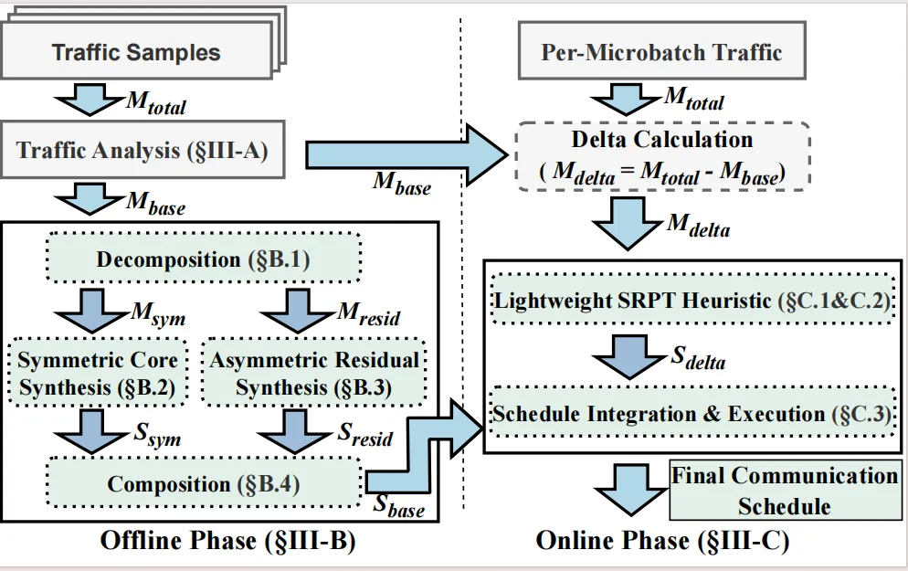 论文概述:基于对称性的集合通信调度合成器(如 SyCCL)虽然在对称网络拓扑和负载下能兼顾可扩展性和全局最优性,但其对集体对称性的强依赖导致现有方法难以有效处理 Mixture-of-Experts (MoE) 模型中固有的动态且高度非对称的 Alltoallv 通信挑战 。针对这一“僵局”,我们提出了 HYDRA,一种能够有效应对非对称流量调度的混合合成器 。我们的核心思想是利用 MoE 流量在宏观上的统计稳定性,将其分解为稳定的“基础流量”和动态的“增量流量”分别处理 。为了打破“传统方法无法在非对称场景下同时保证可扩展性与最优性”这一权衡,我们提出了一套两级分解与混合调度的策略:首先,我们在离线阶段对基础流量进行结构分解,提取出主要的对称核心利用高效的对称感知算法求解,并利用多商品流(MCF)近似模型对剩余的少量非对称残差进行精确优化 ;其次,我们在在线阶段提出了一种轻量级的最短剩余处理时间(SRPT)启发式算法,利用基础调度后的剩余带宽动态调度增量流量,实现对动态突发的快速适应 。实验结果表明,相较于现有的最先进合成器(SyCCL, TECCL)及标准库(NCCL),HYDRA将端到端 MoE 通信时间最多减少了 34.4% 。