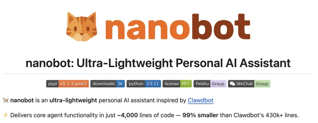 针对这一痛点,香港大学数据智能实验室(HKUDS) 推出了一个名为 Nanobot 的开源项目。正如其名“纳米机器人”,该项目主打“超轻量化”理念。它不仅是一个 AI 助手,更是一个精简到极致的 Agent 框架。Nanobot 的核心设计目标是:用最少的代码实现最强大的功能。整个项目的核心逻辑仅由约 4,000 行 Python 代码构成,相比于市面上动辄几十万行代码的重型框架,Nanobot 减少了 99% 的冗余,却依然保留了强大的任务规划、执行和扩展能力。