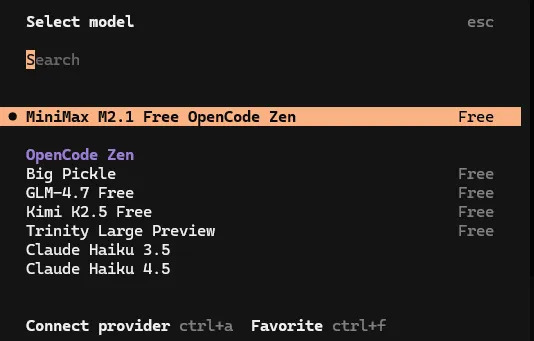 GLM 4.7 Free 也值得试试,智谱AI的模型,国内网络直连,不用担心翻墙问题。Big Pickle 是专门为编程优化的隐身模型,写代码速度挺快。如果你想多对比,还有 Kimi K2.5 可选。