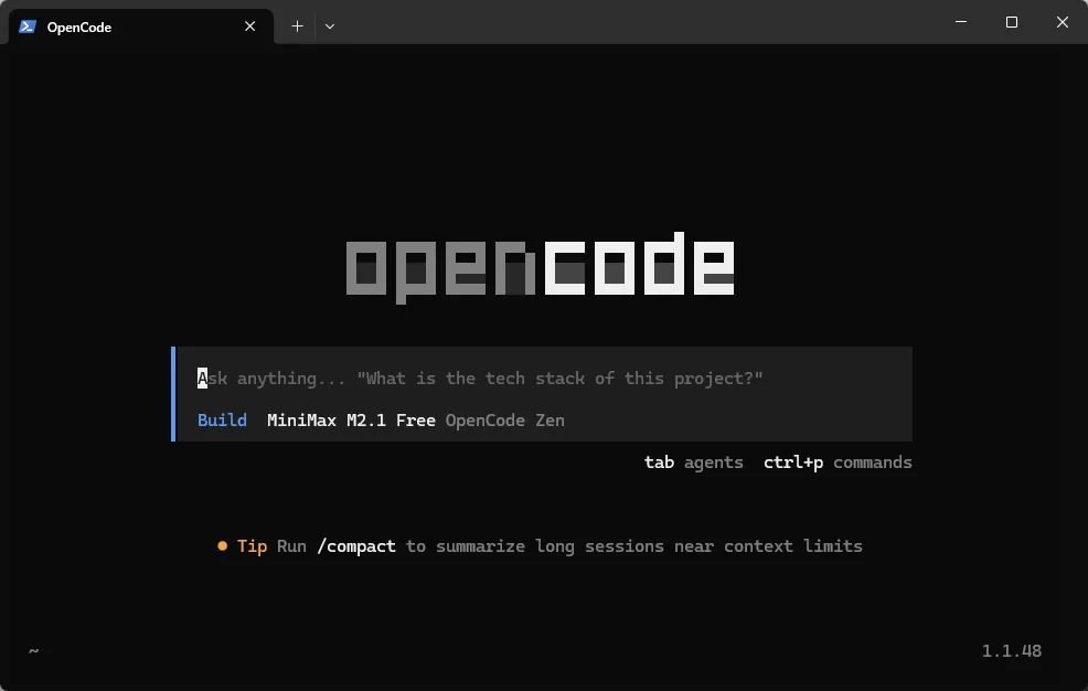 配置好模型后,在终端输入opencode,你会看到这样的界面: