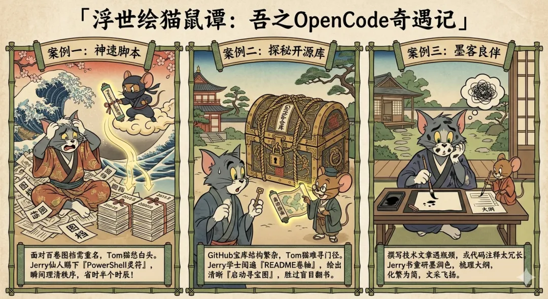 有次我需要批量重命名几百个文件,自己写太费劲。我就问OpenCode:"帮我写一个PowerShell脚本,把文件夹里所有图片按日期重命名"。它直接给了我一个可用的脚本,我改了改参数就跑起来了,省了至少半小时。