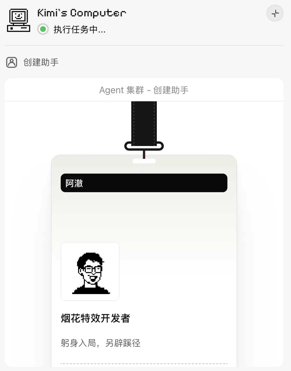 开头的特效复现案例,就用的是Agent集群模式——Kimi给我分配了一个叫阿澈的开发员。