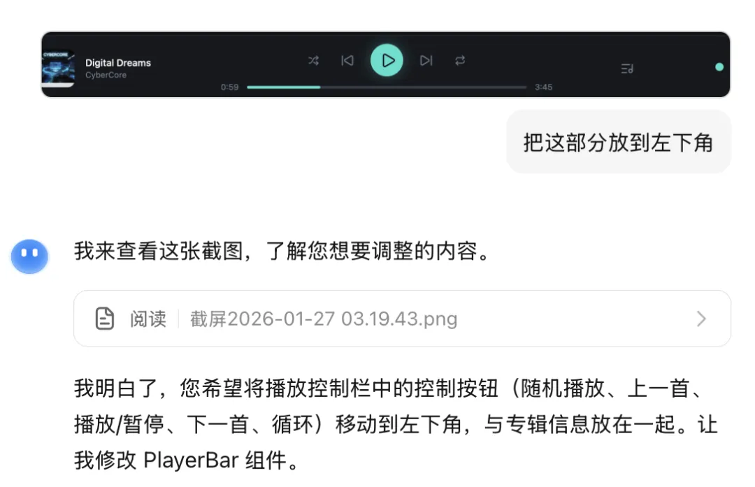 拿刚才生成的音乐播放器网页来说,我想让它调整一下播放器的布局,于是截了个图,圈出播放器的主体部分;