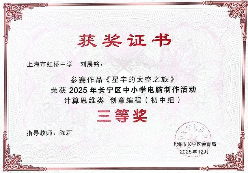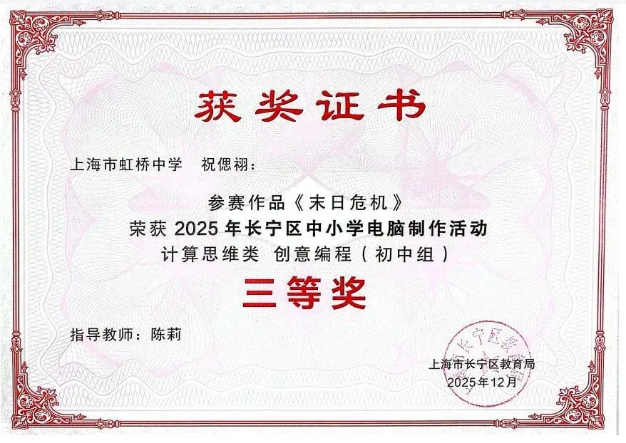 年初,七(3)班祝偲祤和七(4)刘展铭两位同学,凭借精心设计的参赛作品《末日危机》与《星宇的太空之旅》,在2025年长宁区中小学电脑制作活动中,双双荣获“计算思维类创意编程(初中组)三等奖”。