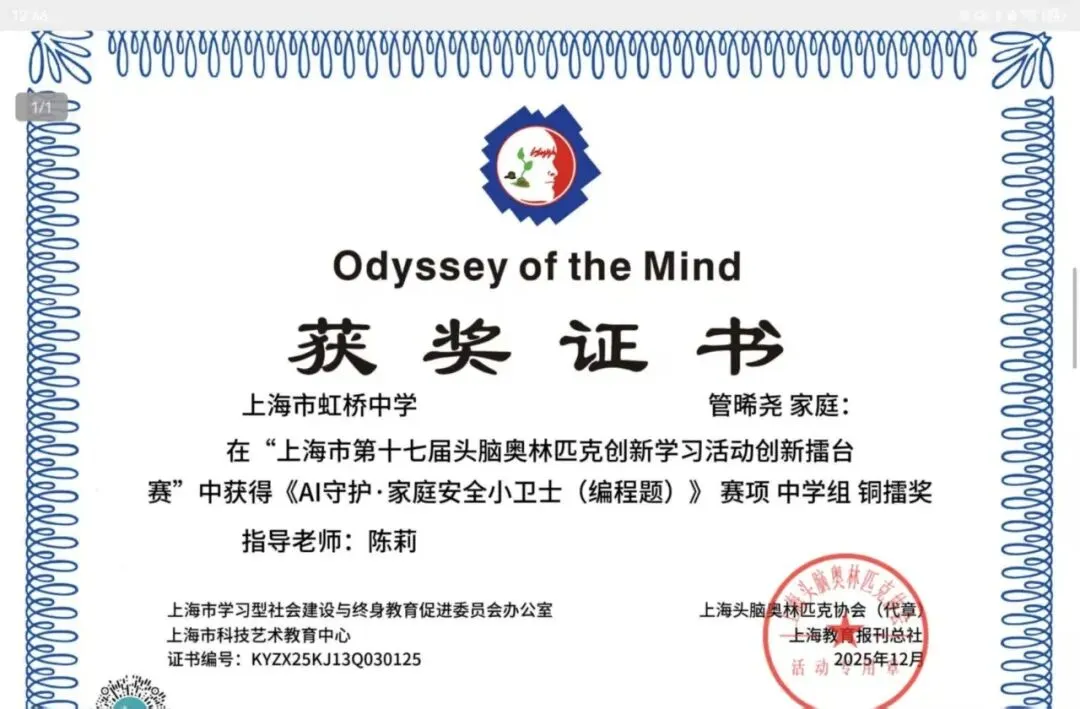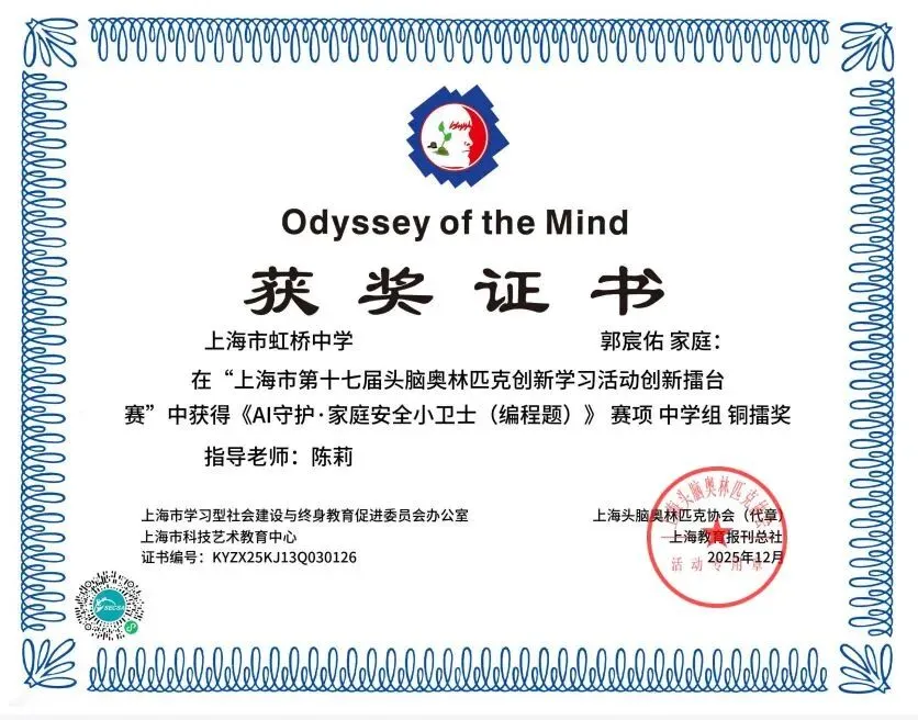 六(4)班郭宸佑、七(1)班傅一腾、七(4)班管晞尧三位同学,获得区一等奖,并推举到市里,在普陀区进行现场赛,最终在《AI守护·家庭安全小卫士(编程题)》赛项中获奖。