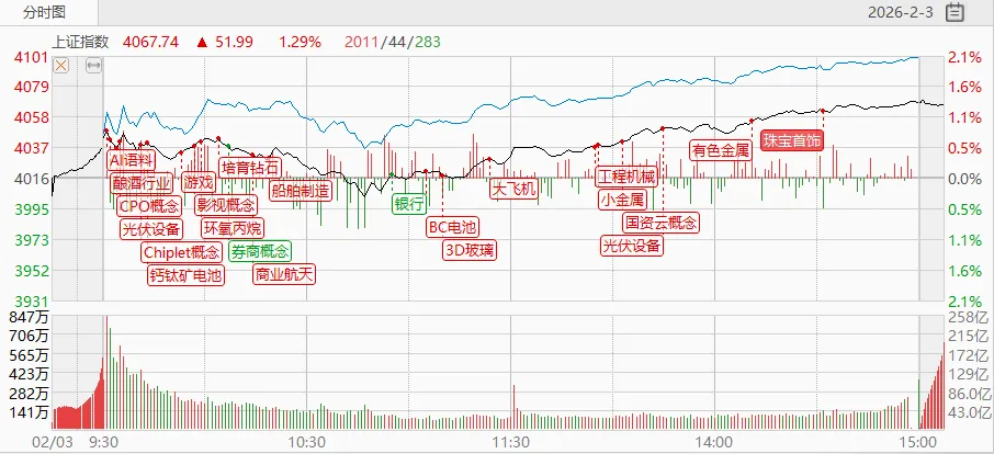 A股三大指数2月3日集体走强,截止收盘,沪指涨1.29%,收报4067.74点;深证成指涨2.19%,收报14127.11点;创业板指涨1.86%,收报3324.89点。沪深京三市成交额25658亿,较昨日小幅缩量411亿。